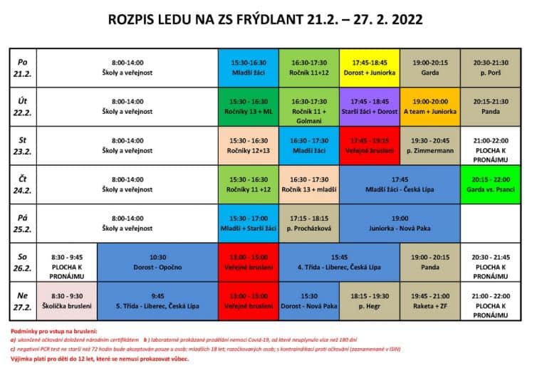 Rozpis ledu na zimním stadionu Frýdlant od 21. do 27. února 2022.