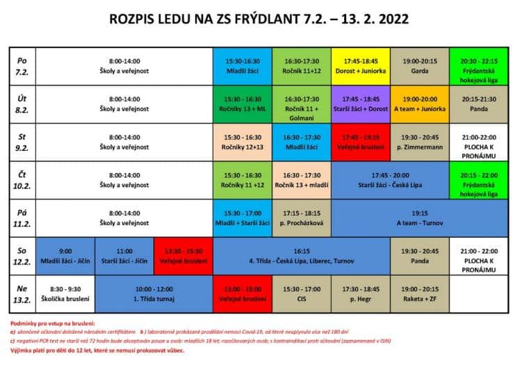 Rozpis ledu na zimním stadionu Frýdlant od 7. do 13. února 2022.