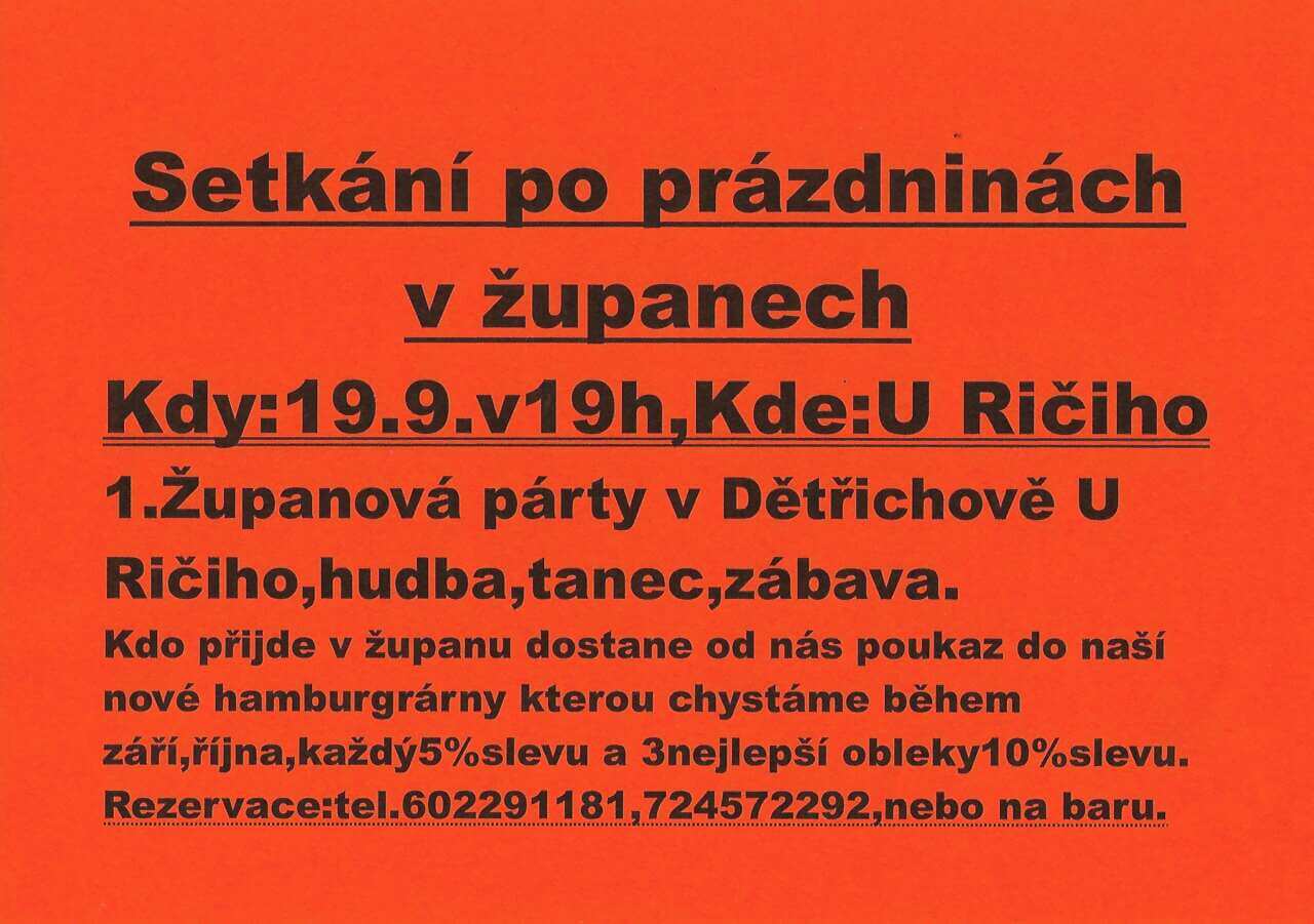 SETKÁNÍ PO PRÁZDNINÁCH V ŽUPANECH 1. Županová párty v Dětřichově U Ričiho KDY: 19. 9. v 19:00 hod KDE: U Ričiho Restaurace & Vinotéka Hudba, tanec, zábava. Kdo přijde v županu, dostane od nás poukaz