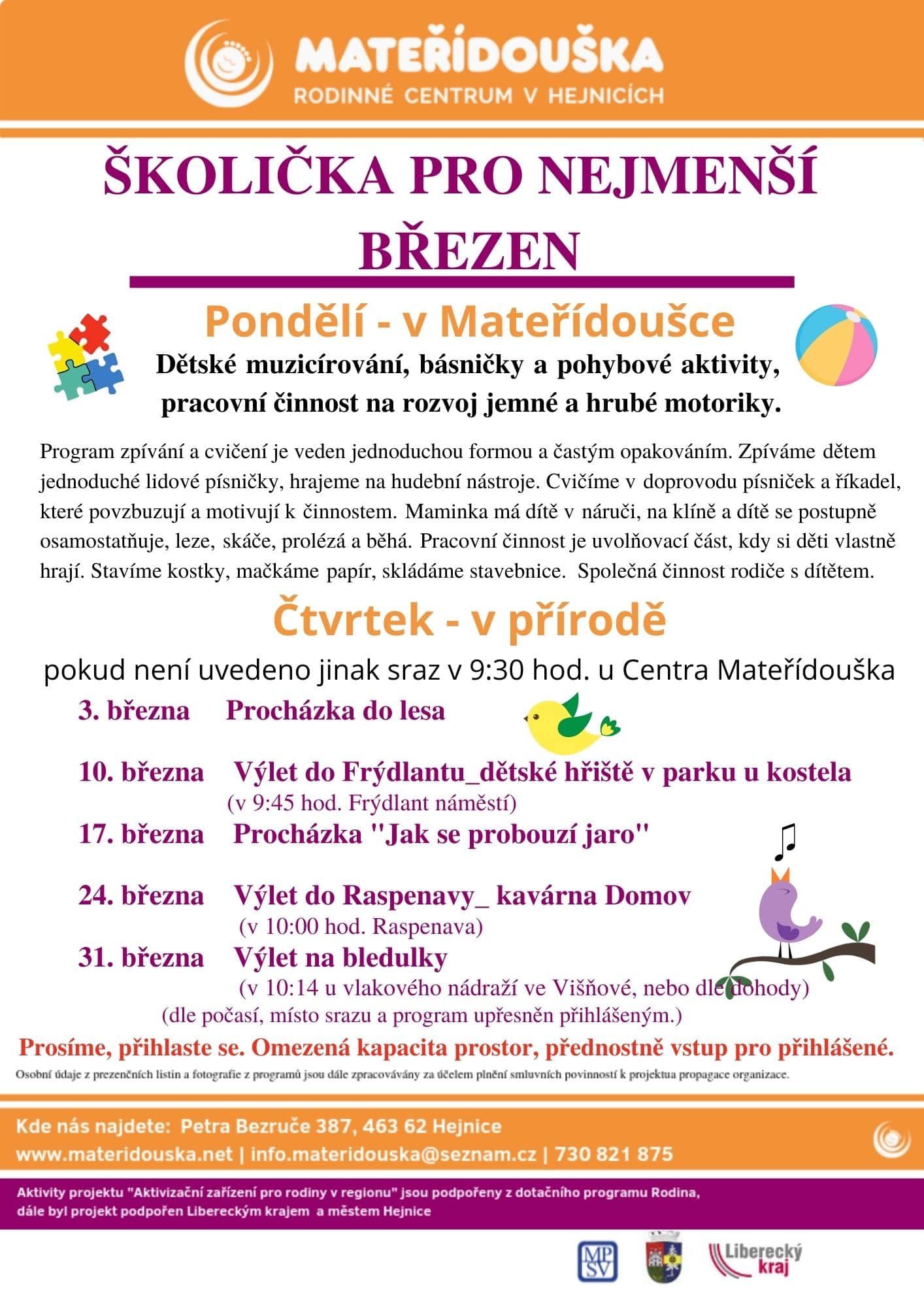 pokud není uvedeno jinak sraz v 9:30 hod. u Centra Mateřídouška.