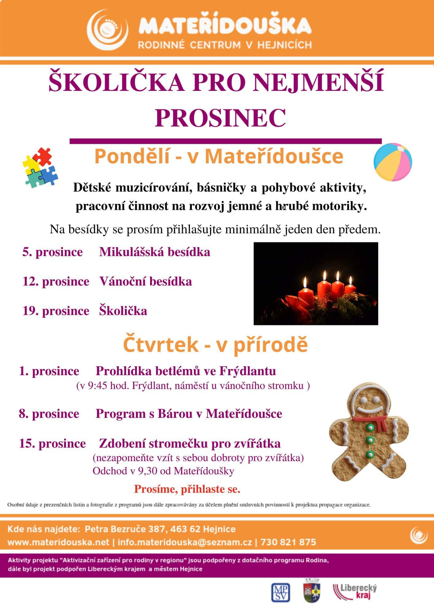 prosinec 2022 Pondělí – v Mateřídoušce Na besídky se prosím přihlašujte minimálně jeden den předem. 5. prosince Mikulášská besídka 12. prosince Vánoční besídka 19. prosince Školička #freedlantsko #freedlantskoeu #frydlantsko #frydlantskoeu #frydlantskyvybezek #visitfrydlantsko #libereckykraj #enjoyfrydlant Dětské muzicírování, básničky