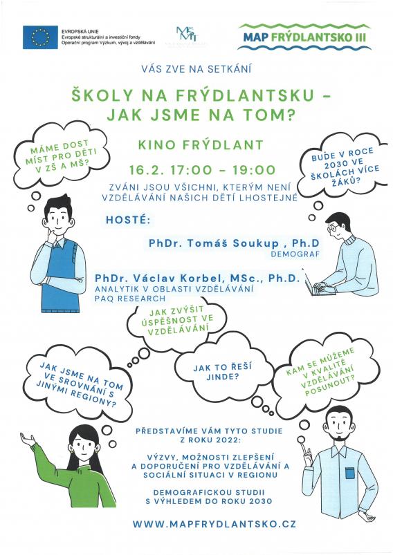Zveme vás na setkání, na které jsou zvaní všichni, kterým není vzdělávání dětí lhostejné. Beseda se koná ve čtvrtek 16. února 2023 od 17:00 do 19:00 hodin ve frýdlantském kině. Hosté setkání