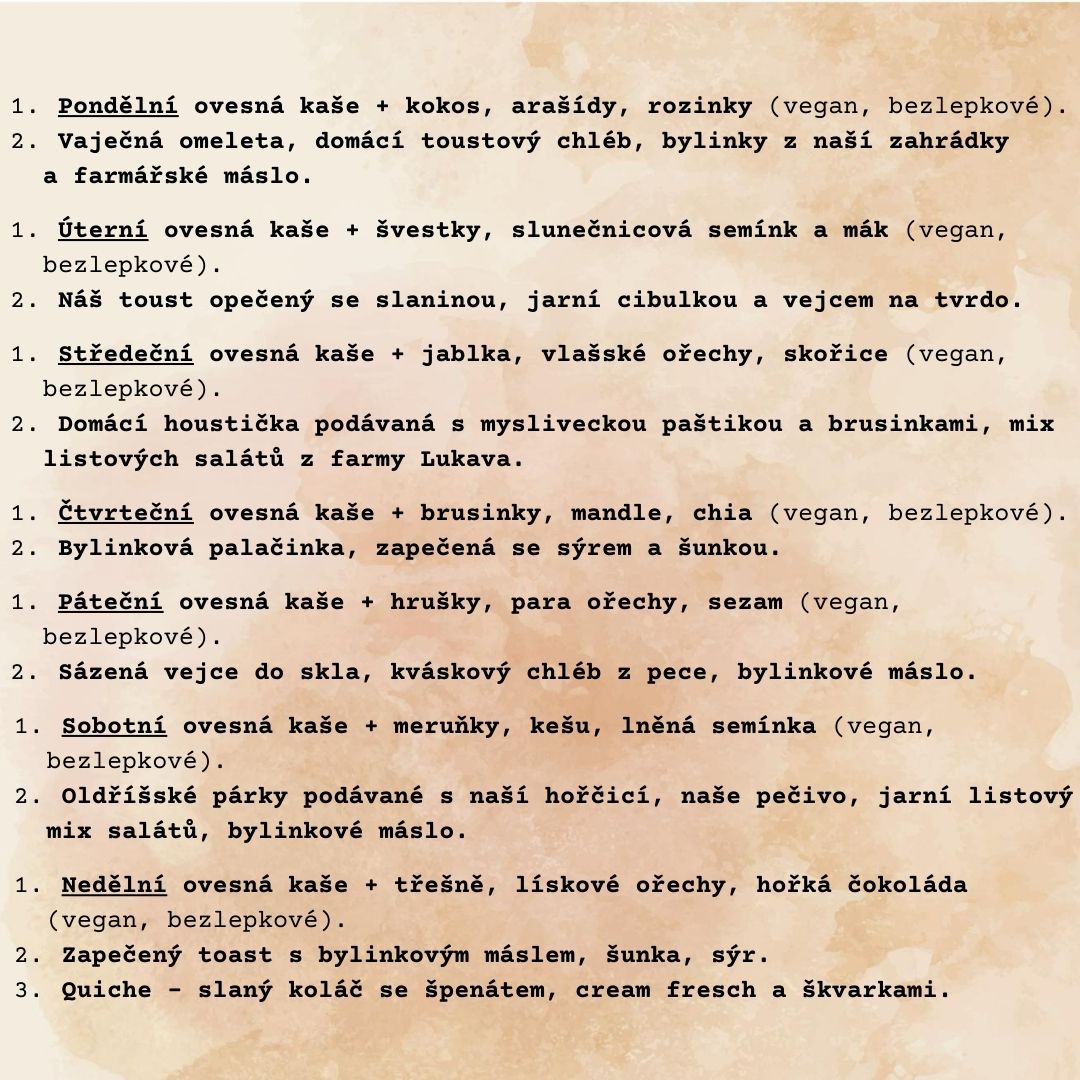 Snídaně budou doplněny zeleninovým salátem dle aktuální produkce od lokálních farmářů.