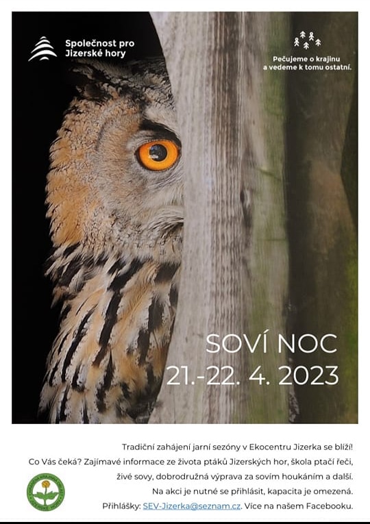 Akce začíná v pátek 21. dubna 2023 v 17:00 hodin v Ekocentru Jizerka č.p. 2 povídáním o ptactvu JH, dále venku setkání se sokolníkem, který přiveze sovy a dravce, sokolnické