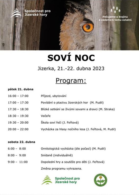 Akce začíná v pátek 21. dubna 2023 v 17:00 hodin v Ekocentru Jizerka č.p. 2 povídáním o ptactvu JH, dále venku setkání se sokolníkem, který přiveze sovy a dravce, sokolnické ukázky, po večeři škola soví řeči pro děti a večer výprava za sovím houkáním. V sobotu brzy ráno ornitologická vycházka po Jizerce, dopoledne pak ekohry s ptačí tematikou pro děti.