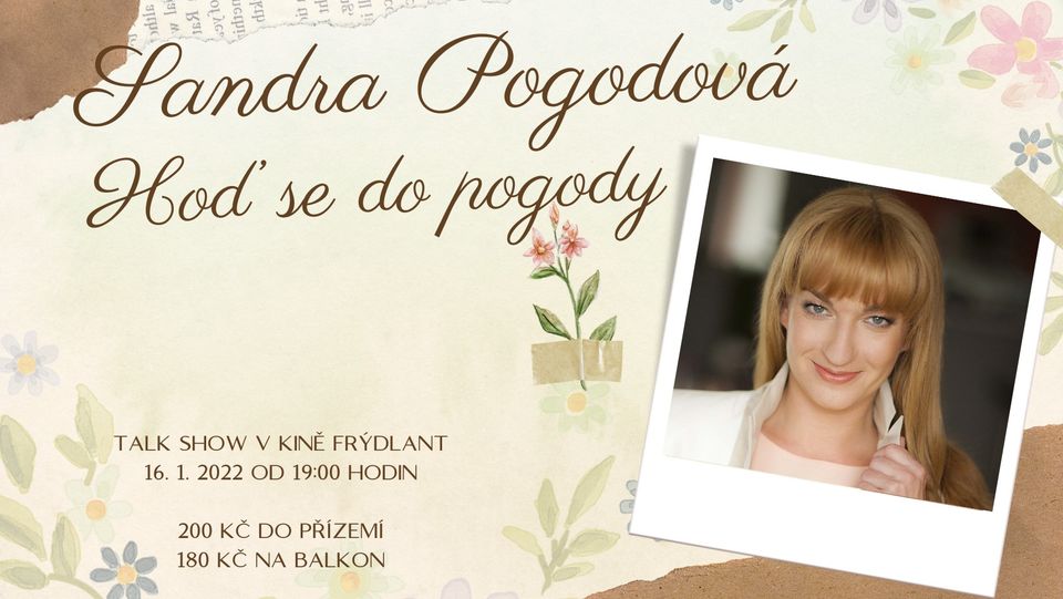 Město Frýdlant vás zve na talk show Sandry Pogodové, Hoď se do pogody. V pondělí 16.ledna 2023 od 19:00 hodin ve frýdlantském kině. Vstupné do přízemí 200 Kč a na balkon 180