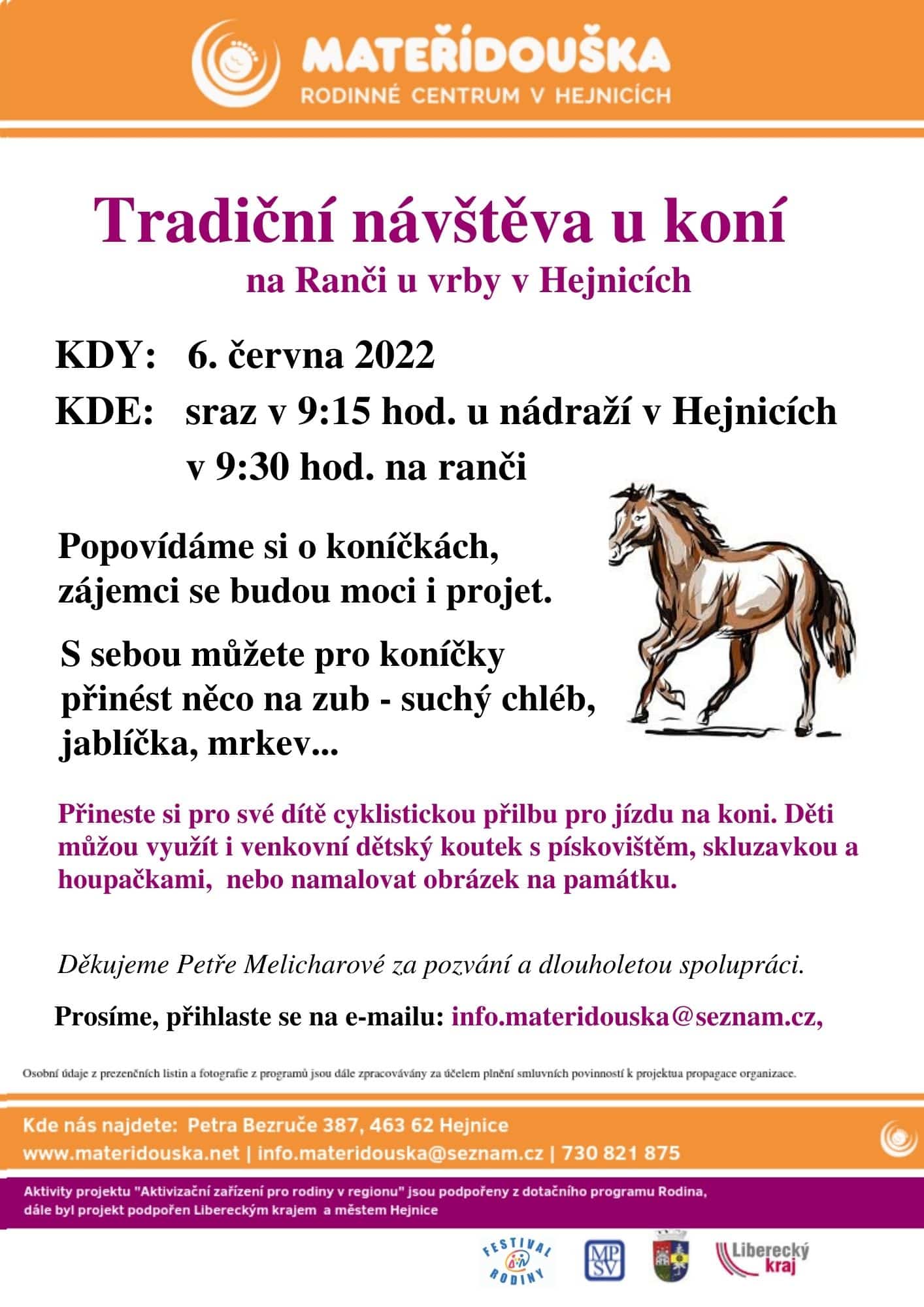 KDY: 6. června 2022 KDE: sraz v 9.15 hodin u nádraží v Hejnicích nebo v 9:30 hodin na ranči Popovídáme si o koníčkách, zájemci se budou moci i projet. S sebou