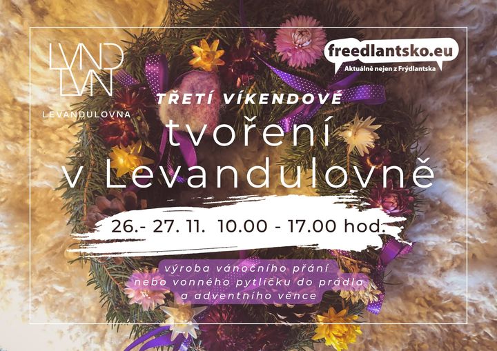 Jedinečná možnost nahlédnout do tajemství výroby Levandulovny. Předvánoční víkendy a dílny pro děti i dospělé v Levandulovně od 10.00 -17.00 hodin. Možnost nákupu vánočních dárků přímo u nás na farmě. Při každé akci