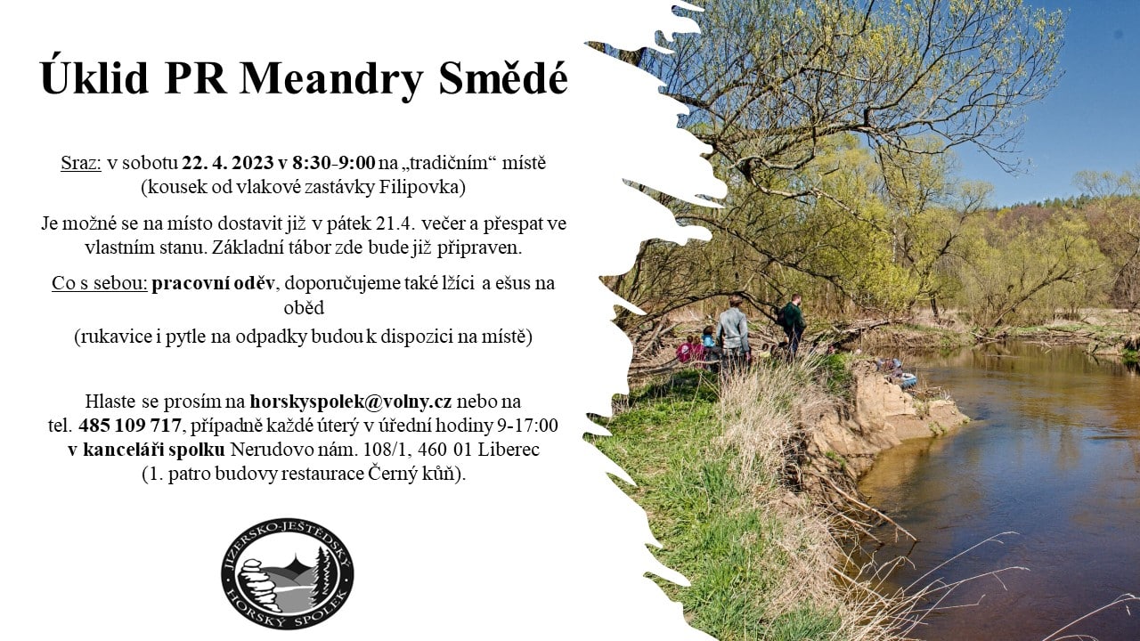 Tradiční úklidová akce Přírodní rezervace Meandry Smědé se uskuteční i letos. Máte volný víkend? Vyrazte s námi do unikátní přírody a pomozte nám ji udržet čistou. Hlaste se na horskyspolek@volny.cz nebo
