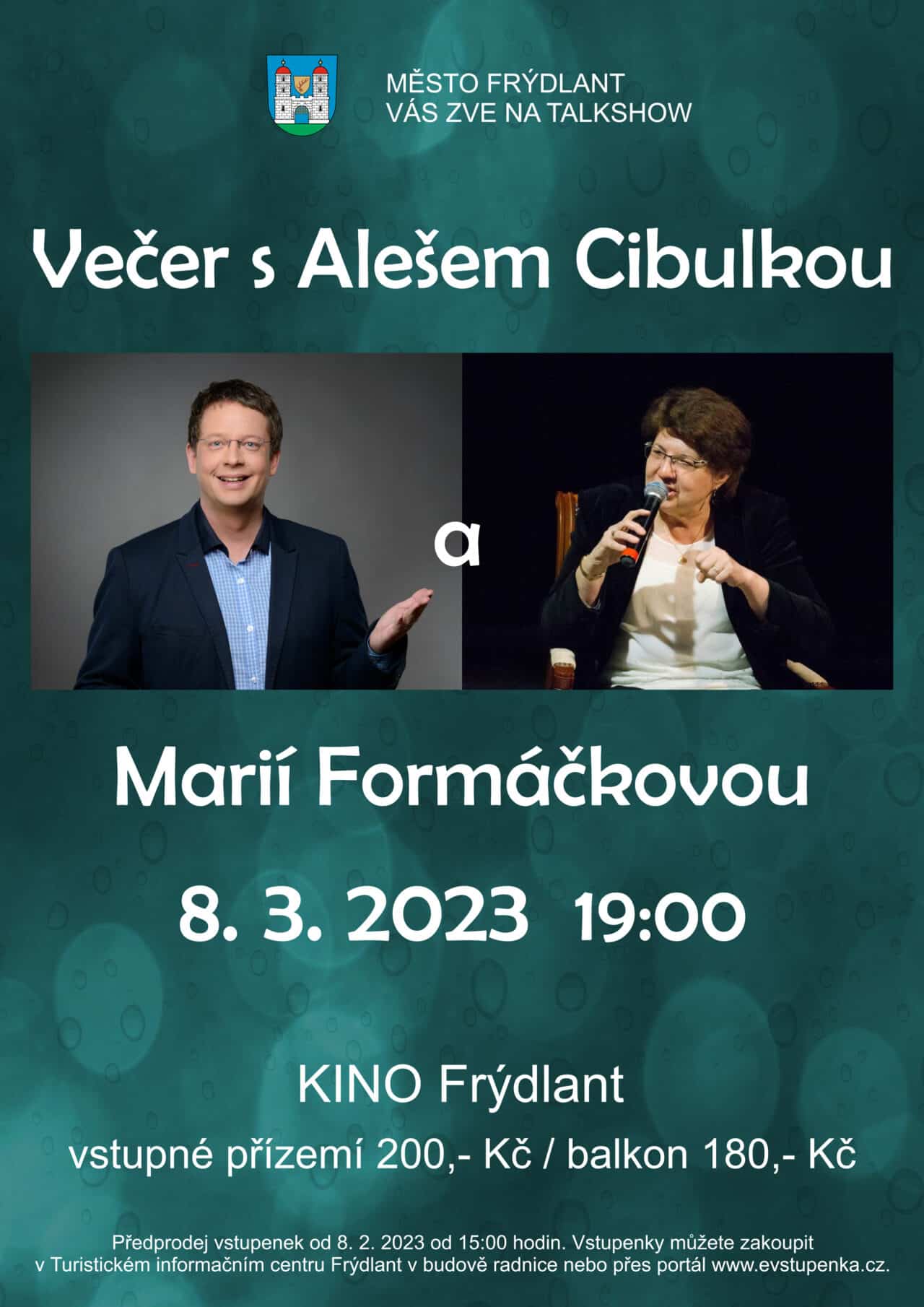 Město Frýdlant vás srdečně zve na zábavnou talkshow moderátora Aleše Cibulky s jeho hostem paní Marií Formáčkovou ve středu 8.března2023 od 19:00 hodin do frýdlantského kina.