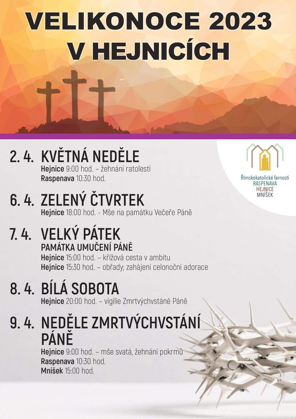 2. 4. KVĚTNÁ NEDĚLE Hejnice 9:00 hod. – žehnání ratolestí Raspenava 10:30 hod. 6. 4. ZELENÝ ČTVRTEK Hejnice 18:00 hod. – Mše na památku Večeře Páně 7. 4. VELKÝ PÁTEK PAMÁTKA UMUČENÍ