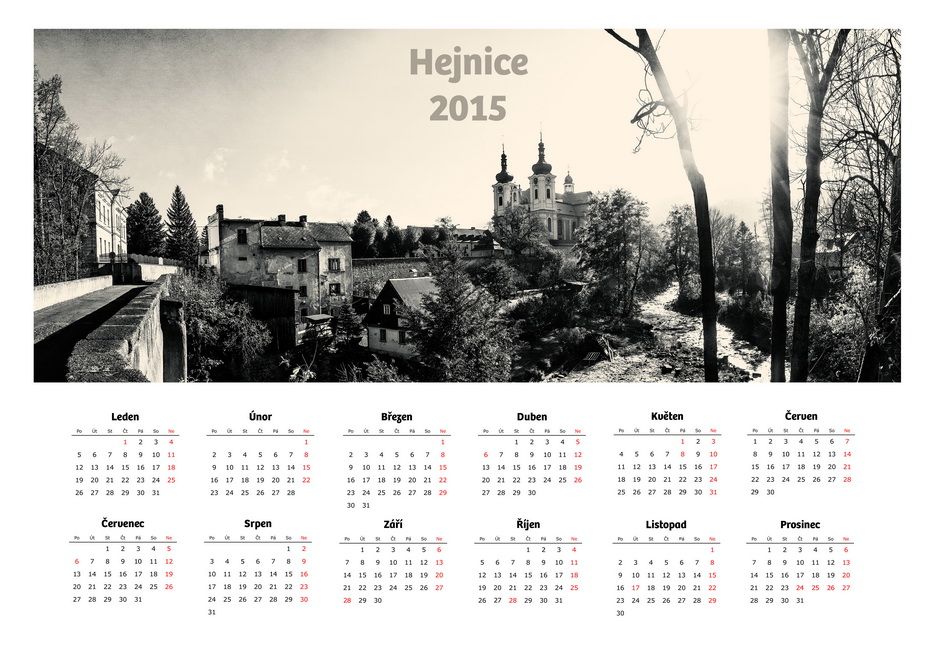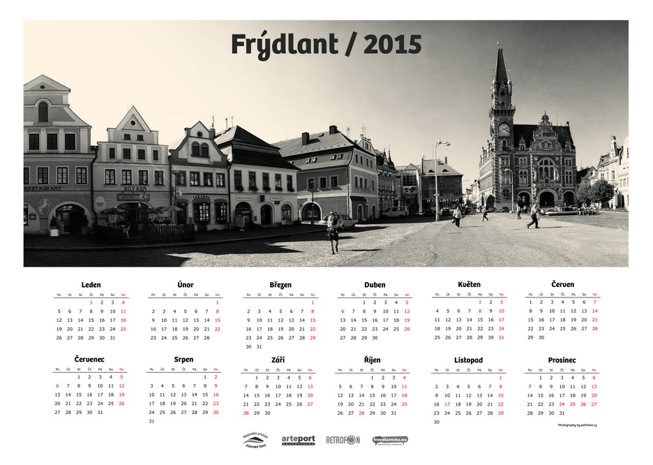 Nástěnné (tzv. mapové) kalendáře o rozměrech 32×45 cm. Na jedné stránce formátu SRA3 je roční kalendárium s vyznačenými svátky a nedělemi, doplněné fotografií. Digitálně vytištěno na papír nejvyšší kvality (Lomond, RayFilm) o gramáži 200-300 gsm. Jak lze kalendáře objednat je popsáno v zápatí této stránky.
