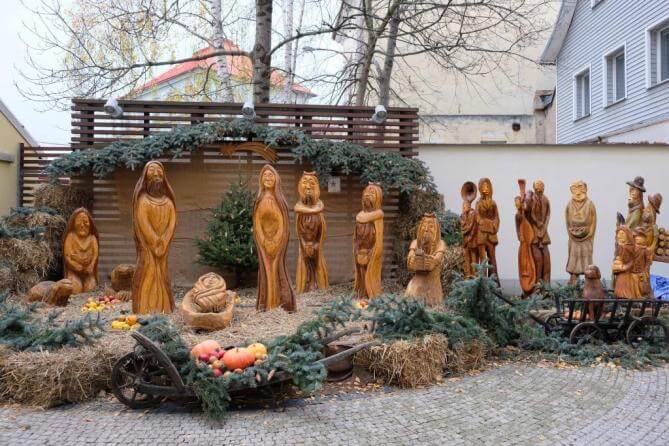 Na nádvoří radnice stojí krásný dřevěný betlém, přijďte se podívat